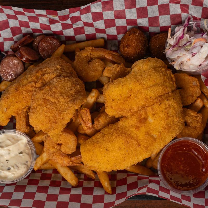 2 flounder fillets, 9 shrimp, ½ sausage link, 2 hush puppies served over fries with tarter and/or cocktail sauce