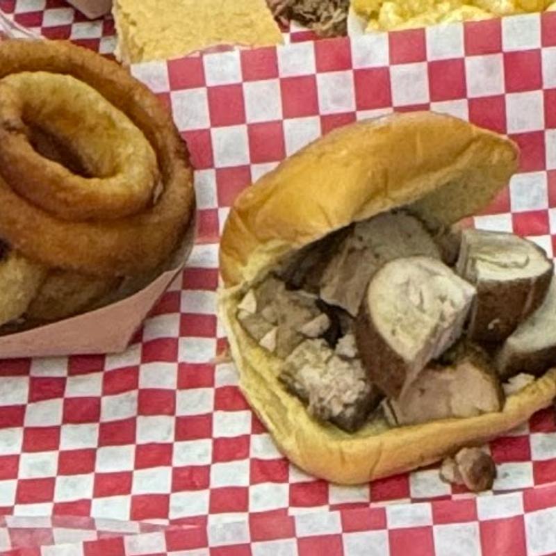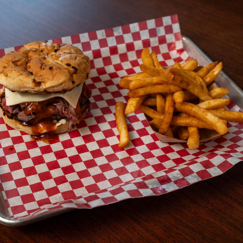Thinly sliced rare roast beef on a toasted onion roll with mayo, cheese, and signature BBQ sauce (is the Classic 3-way).