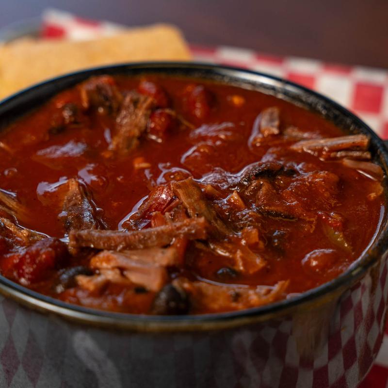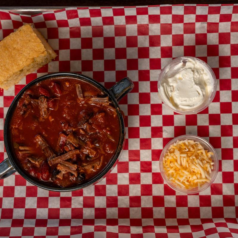 Homemade chili loaded with pulled smoked brisket | Add sour cream, cheese, onions
